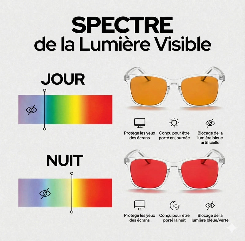 Protégez vos yeux de la lumière bleue et verte émise par tous vos écrans. Préservez votre vue et votre horloge biologique, jour et nuit.