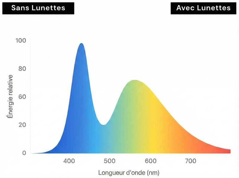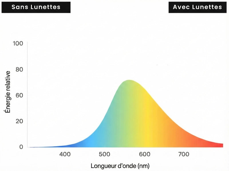 Nos lunettes bloquent 99 % des rayons, y compris les longueurs d'onde vertes qui détruisent la mélatonine.