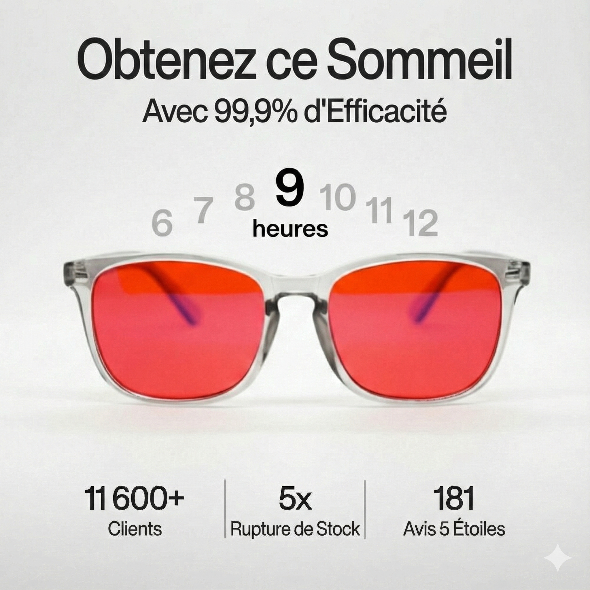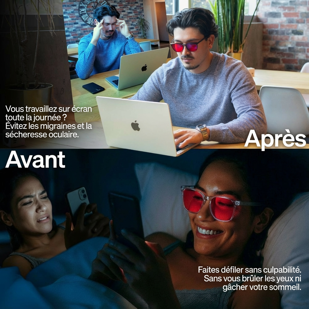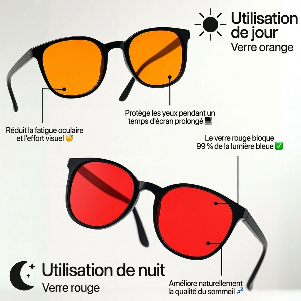 Les verres rouges : bloquent 99 % de la lumière bleue afin que votre cerveau se détende naturellement pour un sommeil plus profond. Ne les portez qu'une à deux heures avant de vous coucher.