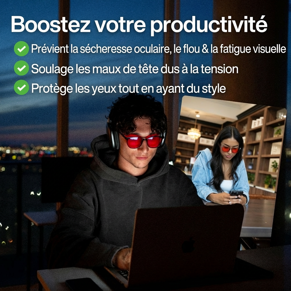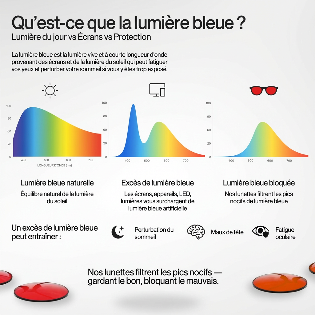 Ce sont des lunettes qui bloquent 99 % de la lumière bleue et verte (400–520 nm), ce qui aide à protéger vos yeux, réduire la fatigue visuelle et favoriser un sommeil plus naturel.
